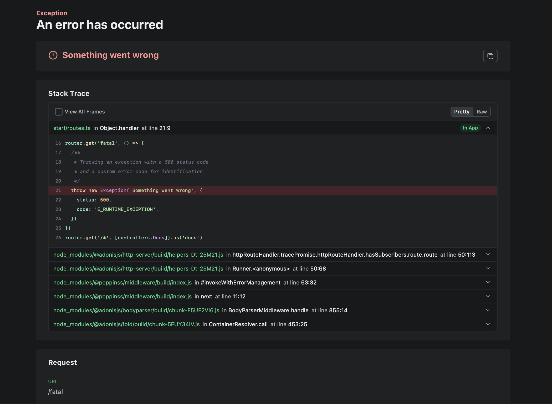 In development mode (with debug enabled), visiting this route displays a beautifully formatted error page powered by Youch, showing the error message, full stack trace, and request context.